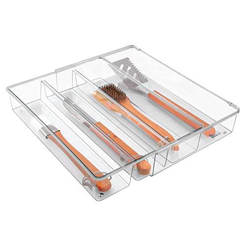 IDesign Linus Portaposate da Cassetto, Separatori per Cassetti in Plastica Senza Bpa con 4 Scomparti Lunghi e Parte Estraibile, Trasparente