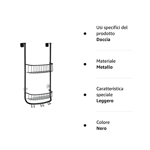 IDesign Portaoggetti doccia da appendere, Piccolo porta oggetti per doccia con 2 cestelli e 3 doppi ganci, Portaoggetti da appendere nel box doccia in metallo, nero