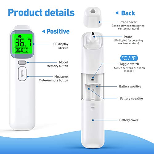 【Termometro versatile 4 in 1】: il termometro digitale ha 4 modalità: termometro frontale per adulti, termometro frontale per bambini e neonati, termometro auricolare, è anche in grado di misurare la temperatura ambiente / oggetto. ℃ e ℉ sono facilmente commutabili.