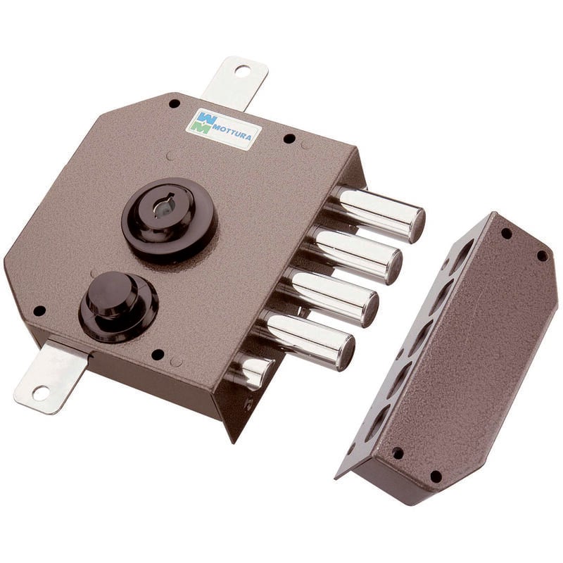 Serratura da applicare con cilindro a pompa Ø mm. 30. Chiusura triplice con mezzogiro, apertura interna con chiave, corsa chiavistelli mm. 40, corsa aste mm. 17, pompa esterna, verniciata, senza aste, 3 chiavi.
