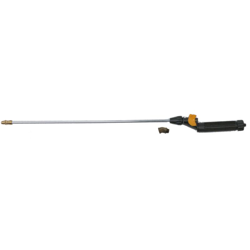 Manico in plastica, ugello regolabile, completa di raccordo curvo.