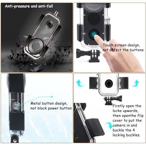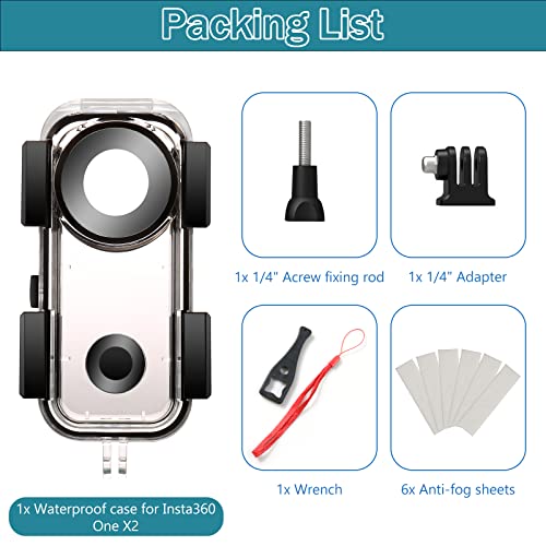 3️⃣『Modelli Applicabili』: questa dive case è adatta solo per la fotocamera Insta360 ONE X2, non per la fotocamera Insta360 ONE X. Lista di consegna: 1 * custodia impermeabile, 1 * base invisibile da 1/4 ", 1 * viti, 6 * pellicola antiappannamento, 1 * mini chiave inglese, 1 * cordino. Nota: controllare attentamente se la copertura protettiva è solida prima immersioni, assicurarsi che la guarnizione e le sue superfici di contatto siano prive di sporco o polvere.