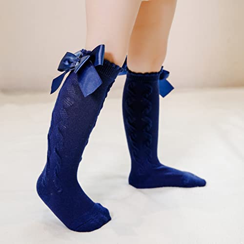 IEFiEL Calze Lunghe in Cotone con Fiocco per Neonate Calzini Ginocchio Eleganti da Principessa Bimba per Battesimo Calzini Autunnali Bambina Calzettoni Tinta Unita Navy Blue 6-12 mesi