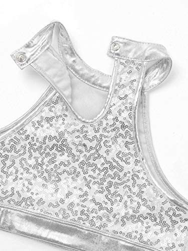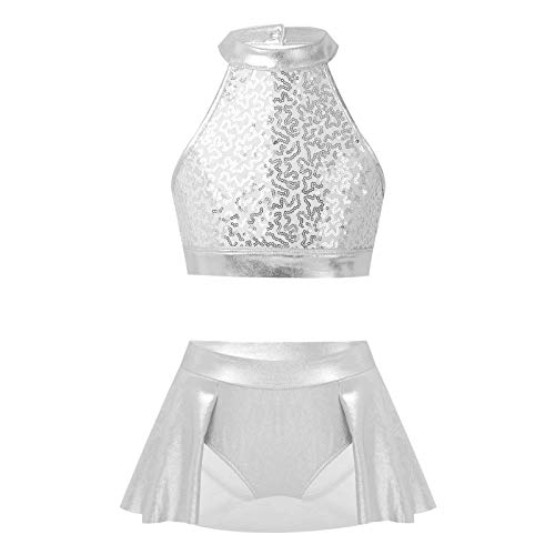 IEFiEL Vestito Danza Classica Bambina Ragazza Paillettes Body da Ballo Danza del Ventre Abito da Ballo Body Ginnastica Artistica Costumi di Danza Crop Top Gonna Dancewear Argento 9-10 Anni