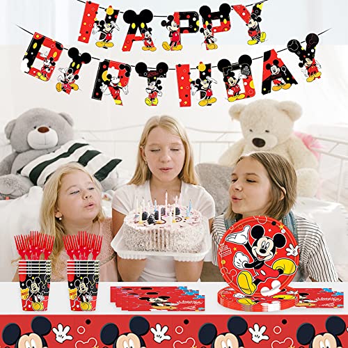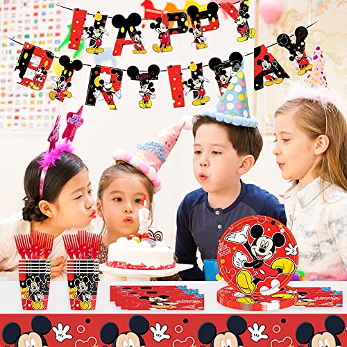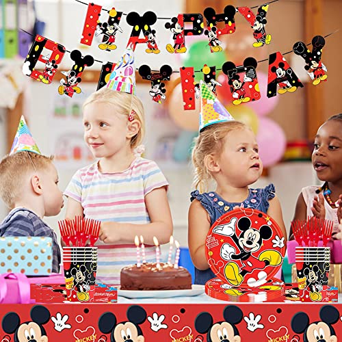 IFHDO Miickey Compleanno Feste Stoviglie, Miickey Feste Stoviglie Kit, Compleanno Feste Decorazioni Kit Tazze Piatti Tovaglia Tovaglioli Bandierine Forchetta per Bambini Compleanno Stoviglie