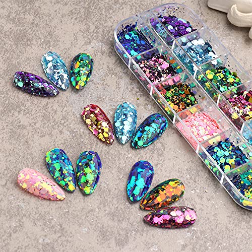 【Paillettes per Unghie】Ogni scatola ha 12 piccole griglie, ogni griglia ha un motivo diverso.Le paillettes per unghie sono realizzate in materiale plastico di qualità, di piccole dimensioni e leggere.
