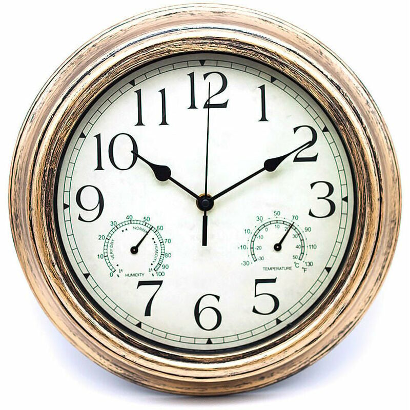L'orologio da parete è adatto a tutte le stagioni e fornirà letture Celsius e Fahrenheit Questi termometri a parete sono perfetti per uso interno ed esterno, che possono essere appesi in piscina, patio, terrazza, veranda, così come la tua cucina, veranda o soggiorno Orologio rotondo decorativo con un'affascinante finitura bronzo e un'area di visualizzazione da 12 pollici, puoi leggere facilmente l'ora e la temperatura a colpo d'occhio. Il termometro da parete da giardino viene anche misurato in base alla precisa funzione di cronometraggio al quarzo, alla temperatura e all'umidità
