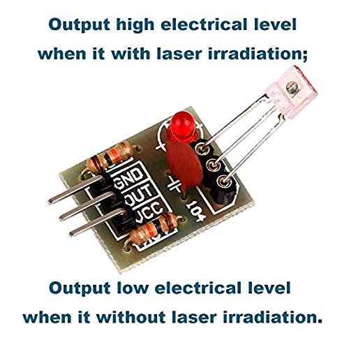 Working voltage: 5V, module size: 1.52x2.22cm/0.6"x0.9". Package included: 5pcs laser recevier sensor modules. The sensor is bent for easier shipping, user can adjust it easily.