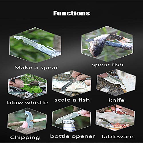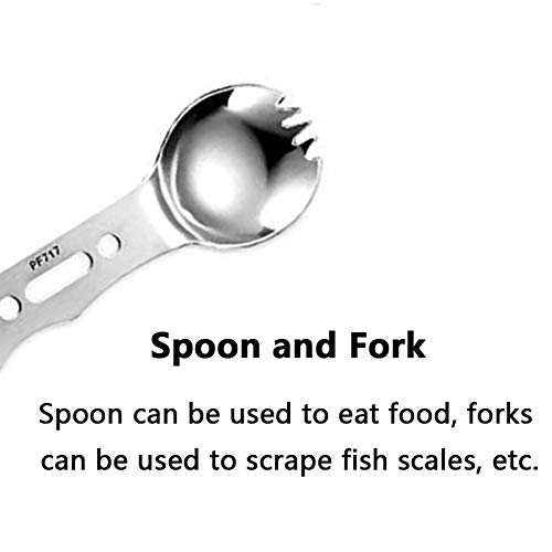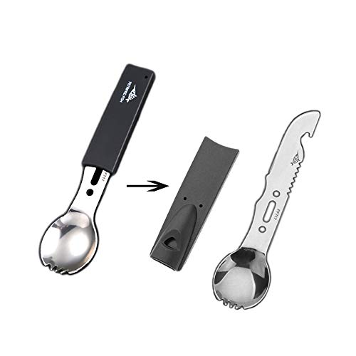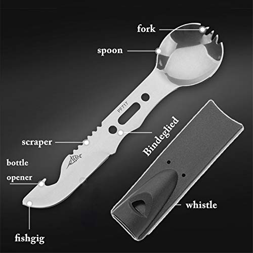 Può essere utilizzato come cucchiaio da campeggio, forchetta, apribottiglie e fischietto.
