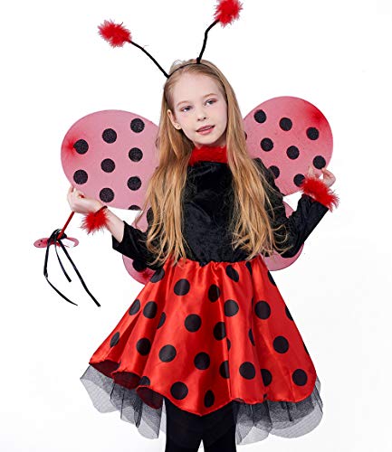IKALI Costume da ragazza coccinella, Abito animale di lusso con ali, Ragazze Fantasia Vestire (10 pezzi) 4-6Y