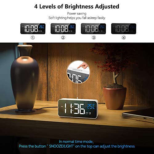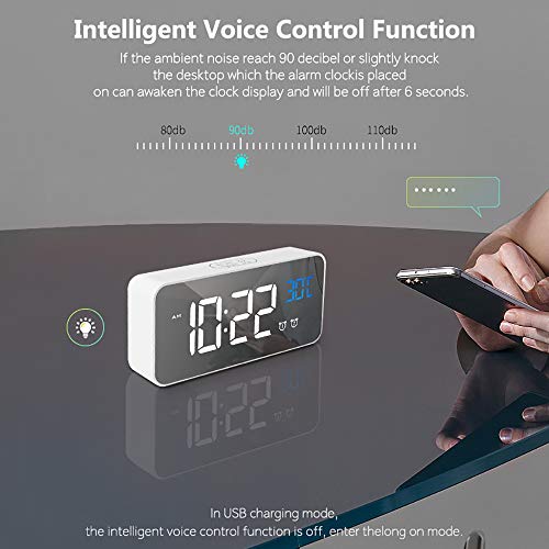 IKEAN Sveglia Digitale Specchio da Comodino Display a LED HD Orologio Digitale Elettrico Ricarica USB con Snooze umidità Musica per Bambini e Bambini(White)