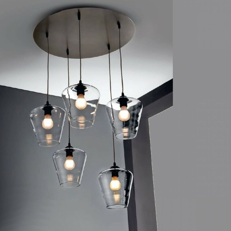 Sospensione cinque luci realizzata con semplici vetri trasparenti della stessa forma che diffondono luce a 360°. Un lampadario che crea movimento nella stanza e allo stesso tempo arreda. VETRI TUTTI UGUALI tipo B (o specificare il modello A o C). Sospensione Pagoda 5 Illuminando con vetri pirex trasparenti Lampadario cinque luci con vetri trasparenti con attacco E27 LED Struttura in metallo verniciata ruggine con filo elettrico in treccia di seta marrone RU OPPURE nella versione più moderna con la base in cromo e filo trasparente. Il lampadario viene montato con cinque vetri tutti uguali, di tipo B come in foto, altrimenti può essere modificato con vetri tipo A o C, da specificare nell'ordine o per e-mail. A richiesta 6 luci con due vetri tipo A, due vetri tipo B e due vetri tipo C (vedere modelli vetro in tutta la serie Pagoda). La Sospensione è provvista di cinque portalampade attacco E27 per lampadina a LED non indichiamo il wattaggio della lampadina a led perchè sono in continua