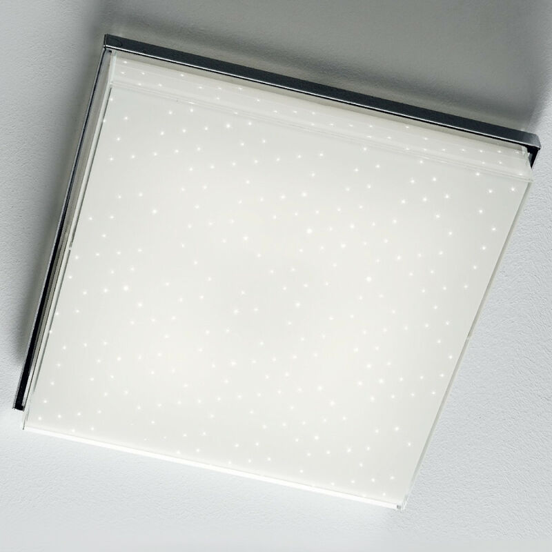 Plafoniera moderna e semplice ma singolare nel vetro tutto traforato per avere un effetto cielo stellato. Una lampada da soffitto che illumina uniformemente la stanza e l'arreda grazie a tutti i suoi puntini che si illuminano. Plafoniera moderna Brilla PL G Illuminando a led Lampada da soffitto effetto cielo stellato con modulo led 35W a luce calda La plafoniera BRILLA PL G è una lampada che si contraddistingue con la sua forma quadrata e un design scintillante. La lampada BRILLA garantisce una superficie decorativa come un cielo stellato. La struttura è in metallo cromato e i diffusore in vetro serigrafato bianco lucido con puntini trasparenti. Emissione di luce diffusa ma scintillante adatta ad ogni ambiente della casa ma sicuramente con un tocco moderno . La plafoniera è provvista di un modulo led da 35W integrato a luce calda a 3000°K. A 3150LM (unità di misura del flusso luminoso). Grado di protezione IP20 adatto solo ad ambienti interni con assenza di umidità. Classe energetica