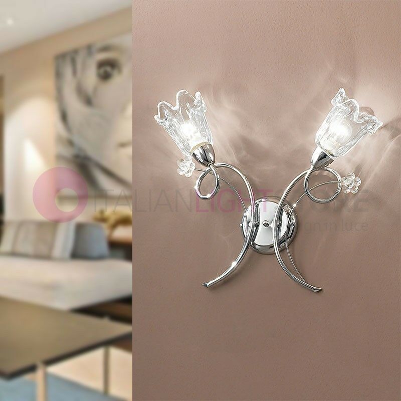 Lampada a Parete a 2 luci, in metallo cromato, ideale per illuminare zone pranzo e camere da letto. Applique a 2 Luci con struttura in metallo cromato arricchita da bellissimi cristalli a forma di fiore disponibili nei colori TRASPARENTE (CRISTALLO), AMBRA e AMETISTA;