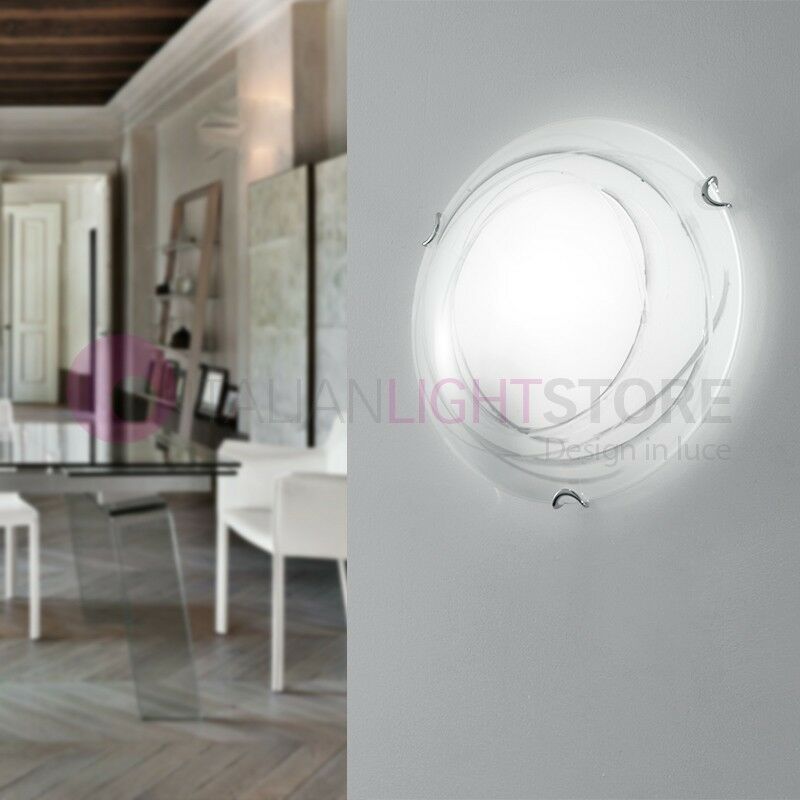 Lampada a parete e soffitto D. 30 cm. con disegno serigrafato grigio. Lampada a soffitto Plafoniera con montatura bianca, particolari in metallo cromato e diffusore composto da un vetro a forma di lente bianca lucida con un disegno serigrafato grigio. Lampada originale, ideale per tutti gli ambienti. DIMENSIONI: Ø 30 cm, H. 9 cm. ELETTRIFICAZIONE: E27 1X MAX 53W (si consiglia l' utilizzo di lampadine a Led).
