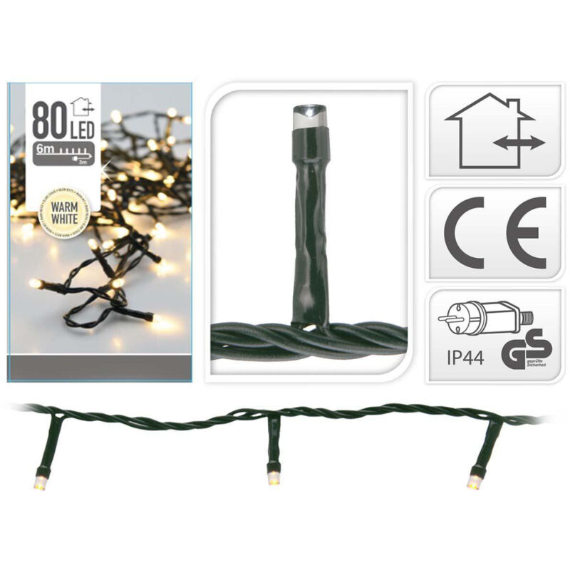 Illuminazione dell'albero di Natale per interni ed esterni con 80 luci LED Catena luminosa a LED 80 luci LED bianche calde da 5 mm di altezza Adatto per interni ed esterni Distanza tra i LED: 7,5 cm Lunghezza del cavo di alimentazione: 3 metri Lunghezza della catena luminosa: ca Lunghezza totale: 9 metri Colore cavo: verde Con adattatore Grado di protezione IP44 Consumo: 1,35 W220- 240 V50-60 HzOmologazione CE/KEMA