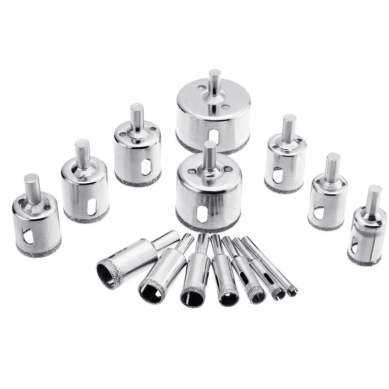 Nome: 6-50m 15pcs apri foro per vetro diamantato Specifica: 6 8 10 12 14 16 18 20 22 25 26 28 30 40 50 mm Dimensione imballo: 140*100*40mm (sacchetto del opp) Peso: 325 g (sacchetto del opp) La superficie della testa della taglierina è trattata con carburo di silicio spesso, bassa resistenza, alta efficienza Design del foro di scarico, non facile scarico delle impurità La superficie è nichelata, albero di alta qualità, lavorazione ad alta resistenza e ad alta durezza