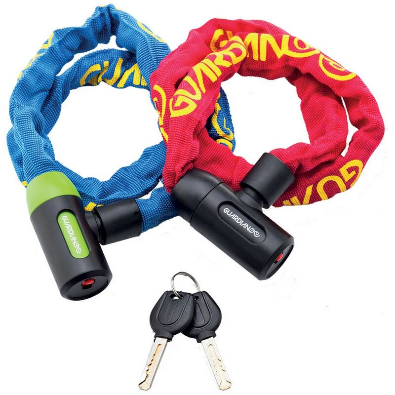 CON DUE CHIAVI. A CHIUSURA AUTOMATICA, CATENA A SEZIONE TONDA RICOPERTA CON GUAINA DI TESSUTO. TESTA LUCCHETTO IN ACCIAIO. ADATTO ANCHE PER BICI E SCOOTER.CM 90 - ø MM 5