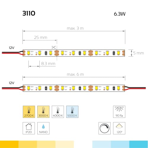Iluminize Striscia LED Micro: 3000K, Ra90, IPNano, di alta qualità, solo 5 mm di larghezza, 120 LED/m, altamente selezionato, 12 V, 6,3 W/m, rotolo 5 m