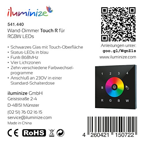 Semplice: dimmer radio da parete di alta qualità e facile da collegare, per lampade a LED RGB, RGB+W e RGBW e strisce LED, alimentato esclusivamente in combinazione con i nostri controller LED iluminize. Questi possono essere acquistati separatamente. Importante: non compatibile con Zigbee 3.0.