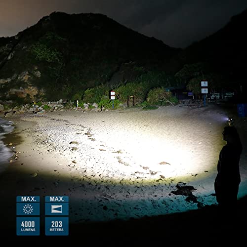 5 modalità: Modalità 1: Turbo: 4000-900 lumen (1 + 38 min), Modalità 2: 2000 a 900 lumen (1,5 min + 39 minuti), Modalità 3: 900 lumen (45 min), Modalità 4: 200 lumen (3H50min), Modalità 5: 20 lumen. 15H) Modalità multipli soddisfano una varietà di esigenze di utilizzo.
