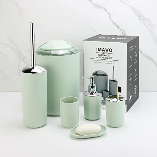 Set completo: set di 6 accessori da bagno verde IMAVO tra cui 1 bidone della spazzatura, 1 dispenser per sapone per lozioni, 1 portasapone, 1 portaspazzolino, 1 portaspazzolino, 1 scopino per WC con supporto.