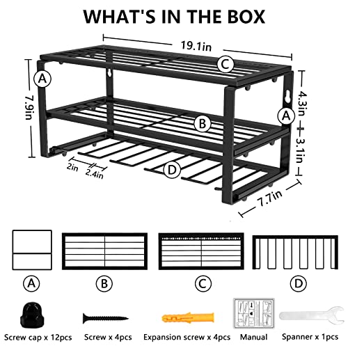 【Stile pratico e alla moda】 Supporto per utensili elettrici a parete misura 19,1 x 7,9 x 7,7 pollici. Lo strato superiore può contenere vari strumenti come cacciaviti. Il design di altezza media può contenere grandi cassette degli attrezzi e strumenti pesanti. Ci sono 5 supporti per trapano al livello inferiore, che possono contenere più trapani elettrici. Questo organizer è sia funzionale che elegante.