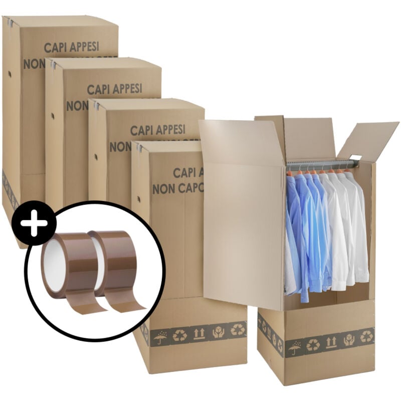 La scatola può diventare un mini armadio grazie all'asta appendiabiti in plastica inclusa e contenere fino a 35 capi. In doppia onda estremamente resistente, le scatole sono prodotte in materiale 100% riciclato, 100% riciclabili e riutilizzabili. Contenuto: 4 scatoloni 50x50x120 cm + 1 nastro adesivo in omaggio. IMBALLAGGI 2000 è il partner ideale per il tuo trasloco.