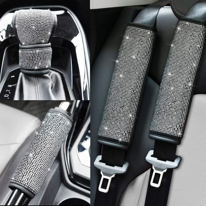 MATERIALE MORBIDO SENZA FADING - - Questo set di spalline per cintura di sicurezza è realizzato in morbido velluto di alta qualità con strass Bling Bling. 4 pezzi / set, otterrai 1 copertura del freno a mano, 2 coperture delle cinture di sicurezza e 1 copertura del cambio, per soddisfare le tue diverse esigenze di decorazioni per auto. Set copri cintura di sicurezza, Bling sotto la luce, scintillante attraverso il parabrezza e facendo brillare la tua auto. Un ottimo modo per aggiornare gli interni della tua auto. Regalo perfetto per donne e ragazze 【ESPERIENZA DI GUIDA CONFORTEVOLE】 - Questo set di copri cinture di sicurezza con strass è progettato per adulti, donne e bambini e può fornire una migliore ammortizzazione in caso di frenata di emergenza o incidente e è in grado di proteggere le spalle della tua famiglia 【UNIVERSALE E MULTIFUNZIONALE】 - Il set di protezione della cintura di sicurezza universale è progettato per adattarsi alla maggior parte dei tipi di cintura di sicurezza