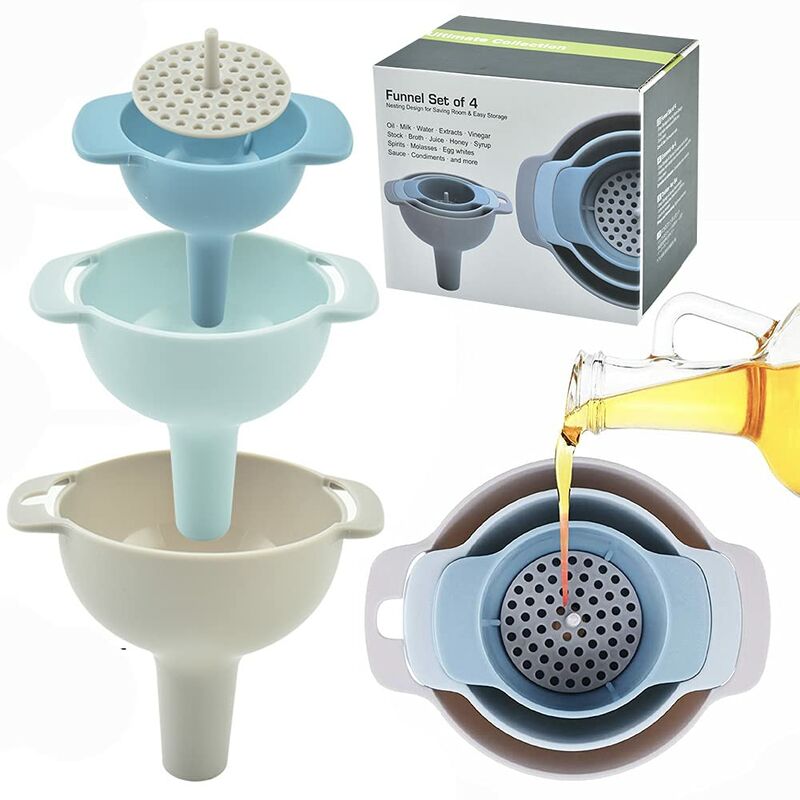 Questi imbuti da cucina sono realizzati in PP alimentare, senza BPA. Questi tre imbuti di diverse dimensioni hanno un design nidificato, risparmiando il 70% di spazio. E puoi appenderli al muro, che sarà pulito e asciutto. Imbuti in tre dimensioni + un filtro rimovibile. Manici su entrambi i lati e molto comodi da usare, le tre dimensioni includono un imbuto grande da 12 cm, medio da 10 cm e piccolo da 8 cm, nonché un filtro intercambiabile, più leggero degli imbuti in acciaio inossidabile, più flessibile, più facile da pulire. Il filtro rimovibile funziona alla grande per setacciare particelle più grandi come fagioli, semi di frutta o altre particelle. Puoi inserirlo nell'imbuto quando devi filtrare i solidi. Quando non viene utilizzato, può essere pulito e riposto in 1 imbuto, il che è molto comodo. Risparmia il 75% di spazio e riduci il rischio di perderne uno. Facile da riporre in mobili da cucina, garage o lavanderie. Il set di 4 imbuti da cucina è adatto al travaso di liquidi e