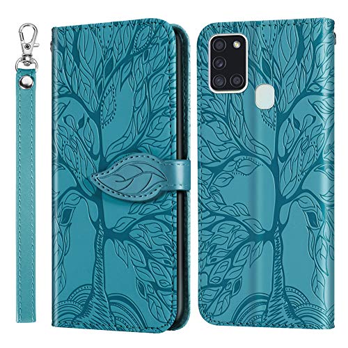 IMEIKONST Custodia Compatibile con Samsung Galaxy A21S, Pelle PU a Libro in Goffrato Custodia Porta Carte di Credito Magnetico Portafoglio Protettiva Caso per Galaxy A21S. Tree Blue RXZ