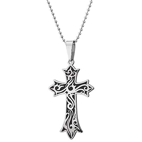 IMETACLII Squisiti Tribal Tatuaggio Croce Ciondolo, Croce Collana con Pendente da Uomo, Acciaio, Argento Nero, Palla Catena 75CM