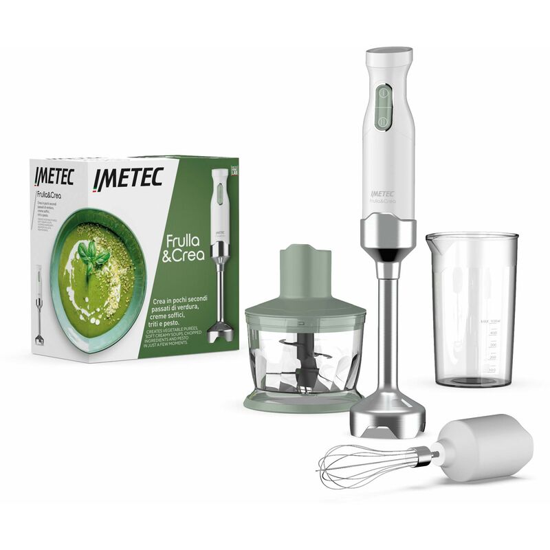 Il frullatore elettrico a immersione Imetec Frulla&Crea, potente e con accessori, offre risultati professionali per preparare in pochi secondi passati di verdura, creme soffici, triti e pesto. In dotazione tritatutto, frusta in acciaio e bicchiere graduato. Grazie alle alte prestazioni il mixer offre risultati omogenei. Potente motore da 1000 W e 15000 giri al minuto per ottenere una vellutata in 30 secondi. Piede XXL per frullare una maggior quantità di alimenti. Le lame in acciaio inox con ampia superficie di taglio permettono di realizzare frullati lisci anche con alimenti duri come noci e mandorle. Il gambo in acciaio inox è adatto per lavorare alimenti caldi direttamente in pentola ed estraibile per rendere la pulizia semplice e sicura. 2 velocità: 1 da utilizzare all'inizio della lavorazione e 2 per amalgamare e omogeneizzare.