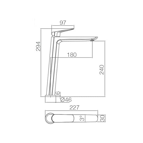 Questo rubinetto è dotato di un aeratore extra piatto. Le dimensioni del rubinetto sono di 294 mm di altezza x 227 mm di lunghezza.