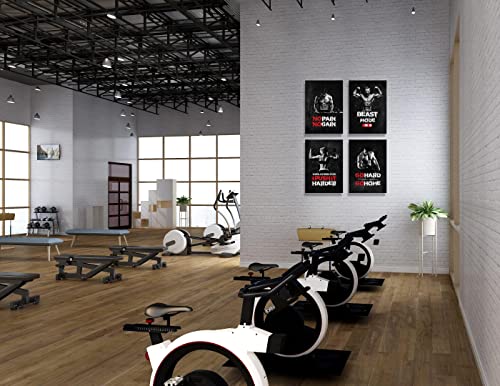 Dimensioni e contenuto della confezione: DIN A4 (21 x 29,7 cm). Contenuto della confezione: 4 poster sportivi con design DIN A4 senza cornice. Vedere nelle immagini: immagini motivazionali con frasi come "No Pain no Gain, GO HARD OR GO HOME, BEAST MODE ON, WHEN OTHERS STOP I PUSH IT HARDER."