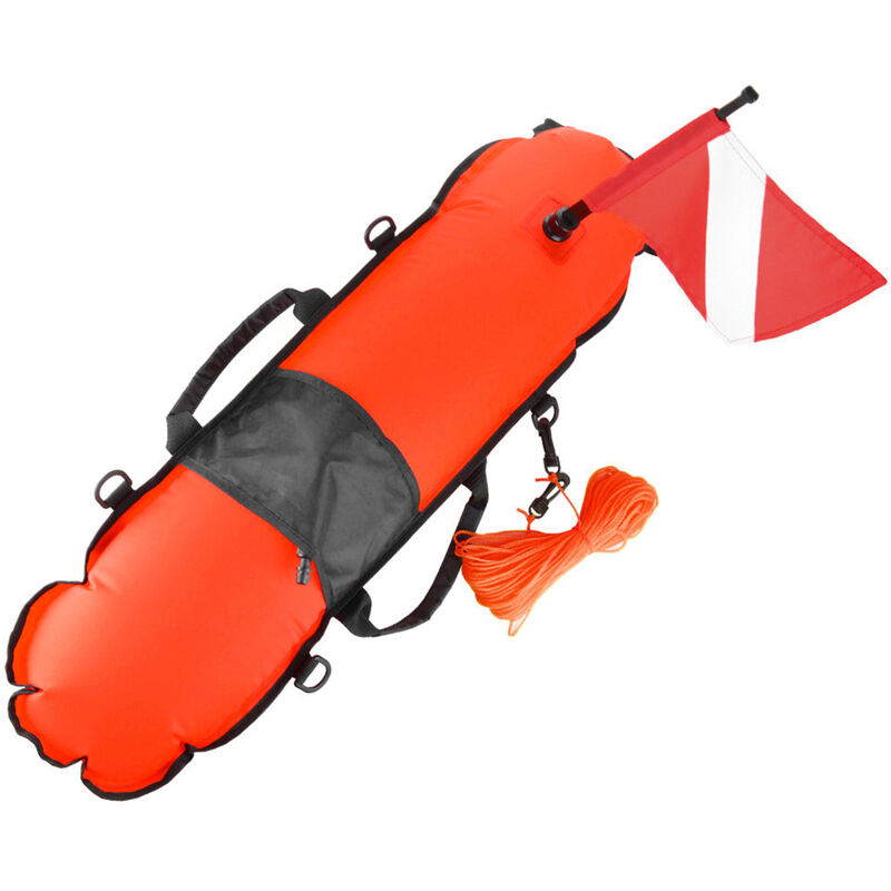 Caratteristiche: Realizzato in tessuto di nylon 210D con rivestimento in TPU resistente all'acqua, fornisce una maggiore resistenza in tutte le condizioni dell'acqua. La forma idrodinamica è specificamente progettata per offrire una resistenza al vento minima e una facile scorrevolezza quando ti immergi nell'acqua. Fornire un modo sicuro per galleggiare e riposare in caso di emergenza. Peso del cuscinetto di galleggiamento: Max.78 libbre. Il colore brillante può migliorare la tua visibilità in mare aperto, puoi essere visto facilmente dagli altri. La bandiera rimovibile installata sul galleggiante significa che c'è un subacqueo in acqua. Una linea lunga 65,6 piedi (20 metri) ti consente di agganciarti a un molo o alla tua barca. 5 anelli a D e 6 cinghie di fissaggio per contenere i tuoi accessori per la pesca subacquea. 2 maniglie laterali consentono di afferrare il galleggiante in modo sicuro. Un gonfiatore orale da gonfiare facilmente per bocca. Veloce da sgonfiare dopo l'uso