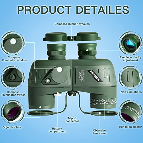 Impermeabile Binocolo da 10x50 per Adulti Canottaggio con Telemetri luminoso e bussola Sport professionali Caccia Portatile Binocolo Wildlife Trave Bird Watching Aggiornato la Lente di Prisma FMC BAK4