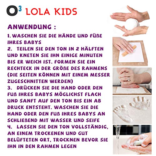 Ricordi - Il set è composto da 3 cornici portafoto in legno bianco con spazio per una bella foto dei ricordi e un'impronta della mano e del piede del vostro bambino. Le istruzioni in lingua tedesca (lingua italiana non garantita) vi spiegano in semplici passaggi come fare le impronte (lingua italiana non garantita)
