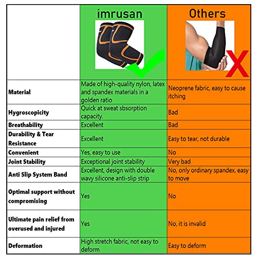 Nuova Tecnologia di Tessitura & Super Traspirabilità - imrusan gomitiera adottano nuova tecnologia di tessitura che aumenta il numero di fori di ventilazione di parecchie volte rispetto alla tecnologia di tessitura tradizionale. Evita i problemi di prurito comuni nei tradizionali tessuti in neoprene mantenendo la stabilità articolare, ha una migliore traspirabilità, può assorbire rapidamente il sudore e mantenere la pelle asciutta, in modo da poter essere usato econtinuamente per molto tempo.