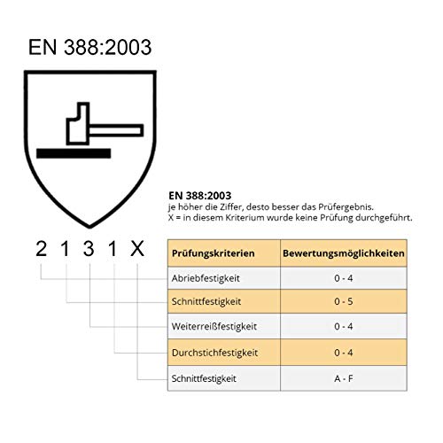 Buona protezione da sporco, abrasioni, schegge e tagli leggeri. Protezione contro i rischi meccanici secondo la norma DIN EN388: 2003 2131X. Durevole grazie all'elevata resistenza all'abrasione e all'elevata resistenza agli strappi.