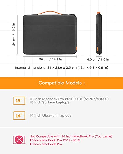 Dimensioni interne: 34 × 23.6 × 2.5 cm. Compatto e spazioso: realizzato per contenere comodamente i laptop, notebook, netbook e ultrabook 14" delle maggiori marche. Compatibile con Surface Laptop 3 da 15 pollici. Non compatibile con MacBook Pro 14" (troppo grande).