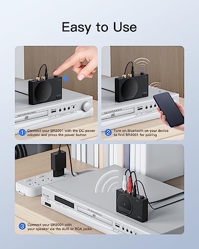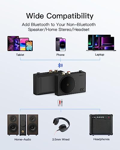 Facile da usare: Non è necessario scaricare alcuna applicazione. È sufficiente collegare questo ricevitore Bluetooth al dispositivo non Bluetooth con un cavo RCA o AUX da 3,5 mm. Attivare il Bluetooth sul telefono/tablet per accoppiarlo e riprodurlo.