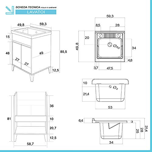 Dimensioni: L.59,3 x P.49,8 x H.85,5 cm (vasca inclusa)