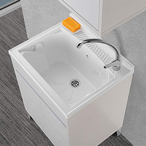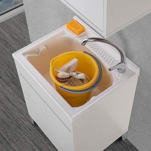 Inbagno Mobile Lavanderia con lavatoio in Resina Linea Way, L.59,3xP.49,8xH.85,5 cm, 3 colorazioni Disponibili, Include ASSE lavapanni e Kit sifone+piletta (Bianco Lucido)