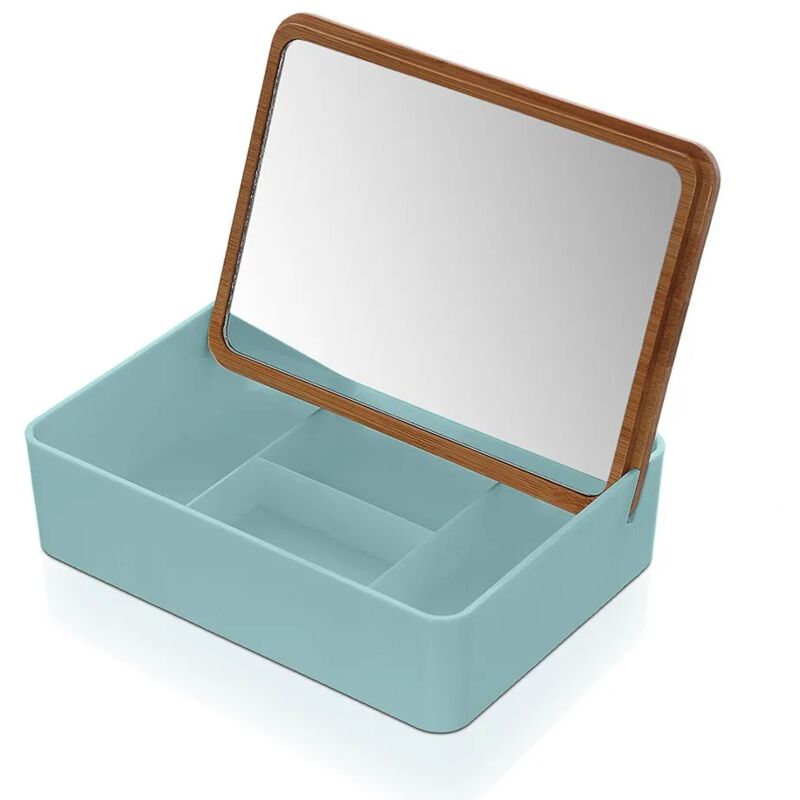 Porta trucchi da bagno in plastica turchese completo di specchio con dettagli in legno di bamboo L' organizer porta trucchi e cosmetici è un accessorio estremamente funzionale che mette a portata di mano tutti i prodotti per il make-up, senza che vi siano perdite di tempo utile nella loro ricerca all'interno della composizione bagno. Il porta trucchi organizer è realizzato in plastica dalla splendida finitura turchese, ideale per personalizzare con colore e stile il proprio arredo bagno . L' organizer cosmetici è costituito da un pratico coperchio in legno di bambù, che in posizione di riposo funge da elemento coprente e protettivo per i propri cosmetici, mentre quando si è in procinto di truccarsi basterà girarlo nel senso inverso e avrete a disposizione un comodo specchio con il quale aiutarvi durante la fase di make-up. L' organizzatore trucchi ha delle dimensioni compatte che permettono un suo inserimento su qualsiasi piano d'appoggio o mobile bagno senza che questi crei il benchè