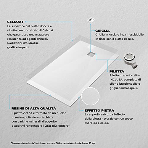 Inbagno Piatto Doccia 80x140 Resina con Effetto Pietra Serie Arena, ultraslim - riducibile su Misura, Completo di griglia e piletta di Scarico