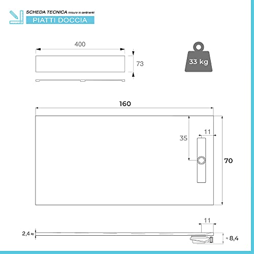 Inbagno Piatto Doccia Resina 70x160 Effetto Pietra Bianca Serie Plaza, Ultrasottile - riducibile su Misura, Include griglia e piletta di Scarico
