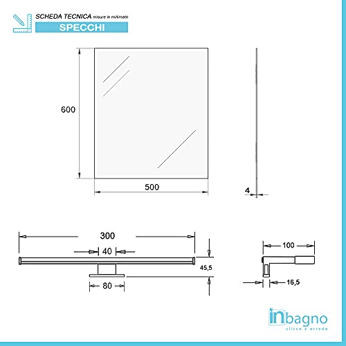Inbagno Specchio con Lampada LED Reversibile, Completa di Luce LED cromata da 30 cm a Risparmio energetico (Luce Fredda, 50x60 Reversibile)