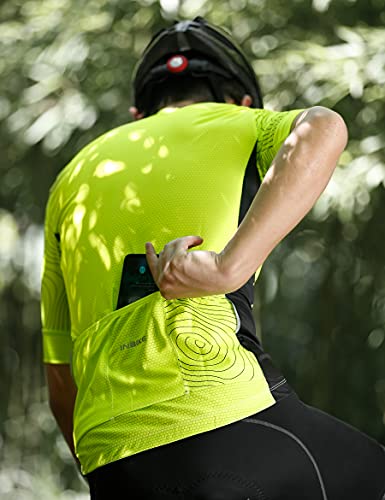 【Fascia antiscivolo&Tasca posteriore】Le tre tasche posteriori permettono di sistemare gli oggetti nelle uscite in bicicletta, le fasce aderenti elastiche di silicone sull'orlo che evita i vestiti di scivolare verso su. Il design full zip rende la nostra maglia da ciclismo a manica corta adatta al tuo corpo e ti regala una piacevole esperienza.