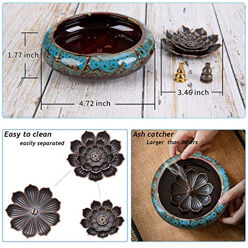 Raccogli cenere: il bruciatore è composto da due parti. Posizionare il bruciatore di incenso in ottone e loto sulla base del vaso di incenso in ceramica. Il diametro di 4,72 pollici è abbastanza largo per catturare la cenere dal bastoncino di incenso. Cattura facilmente la cenere e mantiene la tua casa sufficientemente pulita.